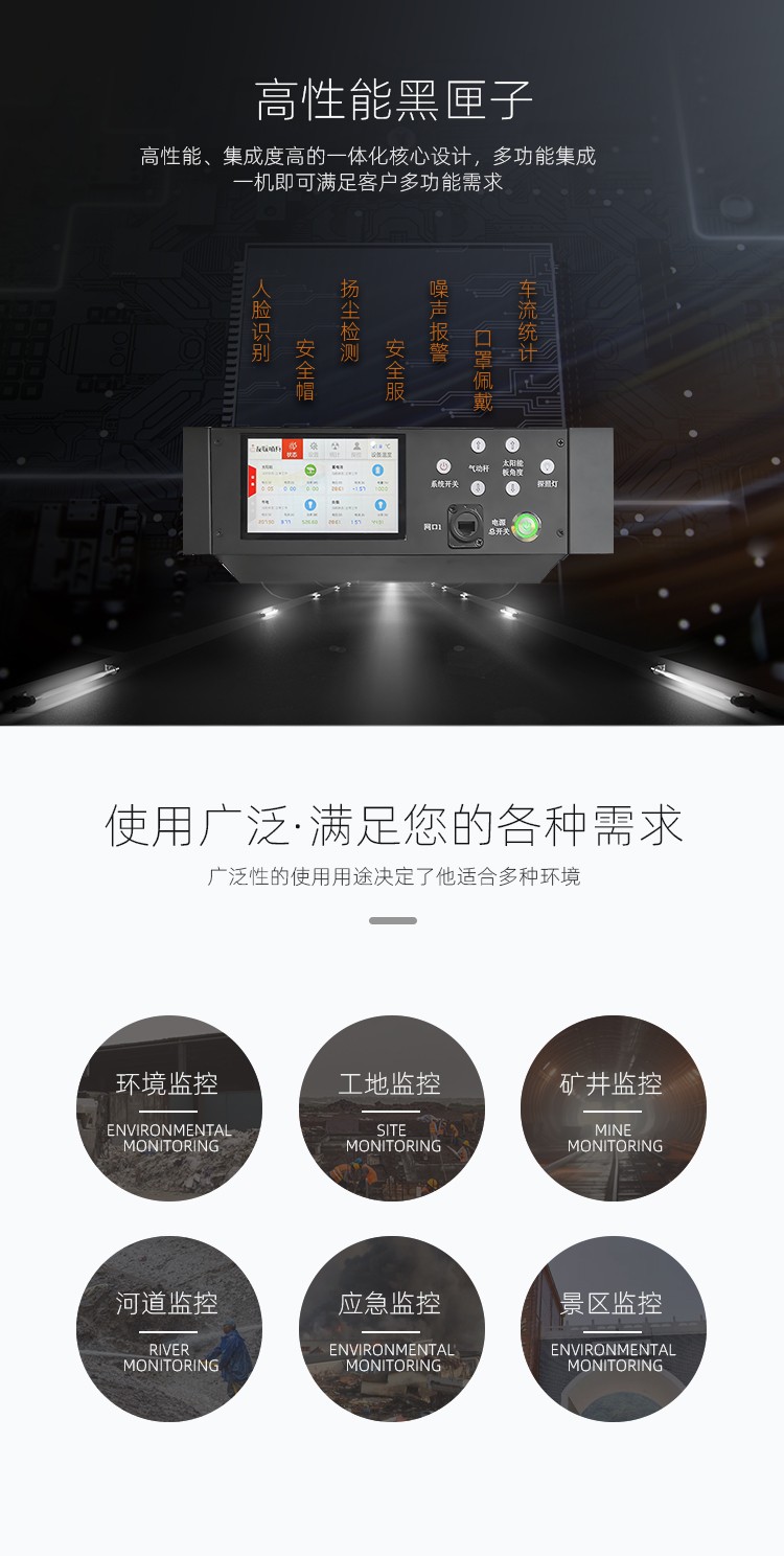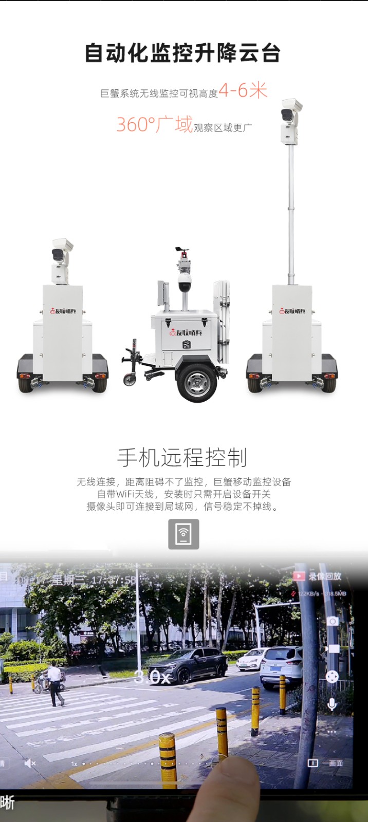 友聯(lián)哨兵巨蟹款太陽能供電工地揚塵氣象監(jiān)測移動監(jiān)控車(系統(tǒng)),自帶網(wǎng)電,具備較高的機動性,系統(tǒng)可集高清視頻監(jiān)控、照明、報警、廣播、對講、氣象環(huán)境監(jiān)測(選配)、存儲、控制、無線傳輸、一鍵升降等功能于一體,并可具備市電、太陽能等多種能源補給方式,提升續(xù)航時間,以適應各類復雜的環(huán)境。戶外使用,不懼風雨。