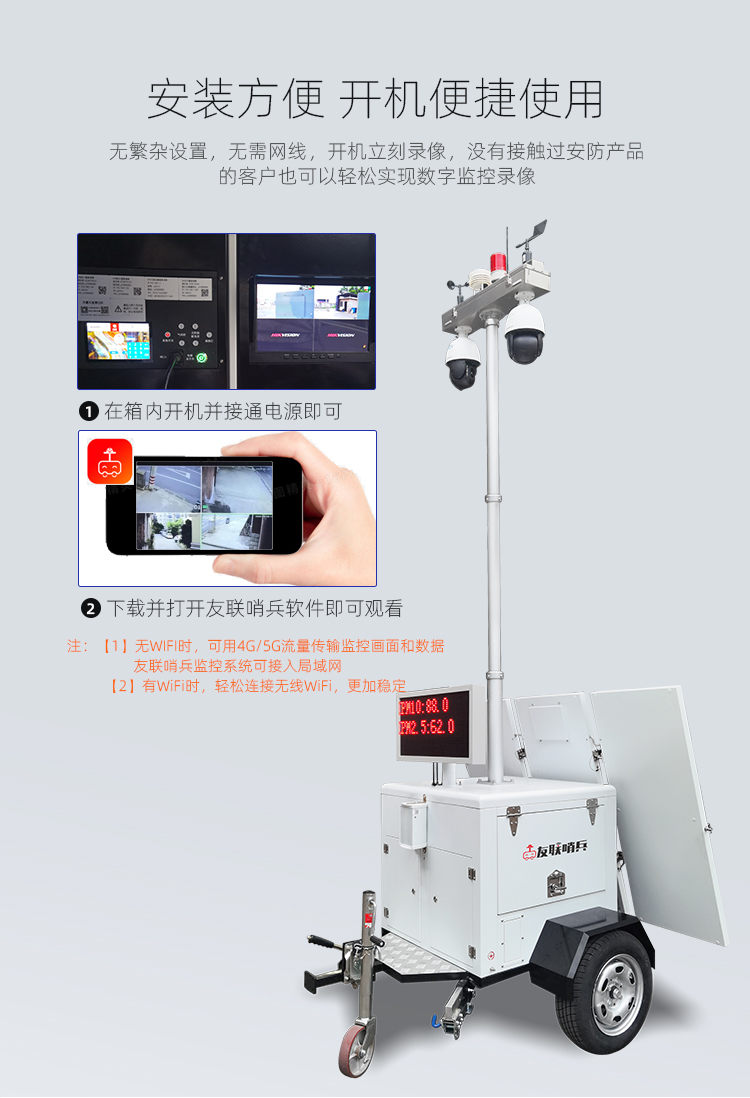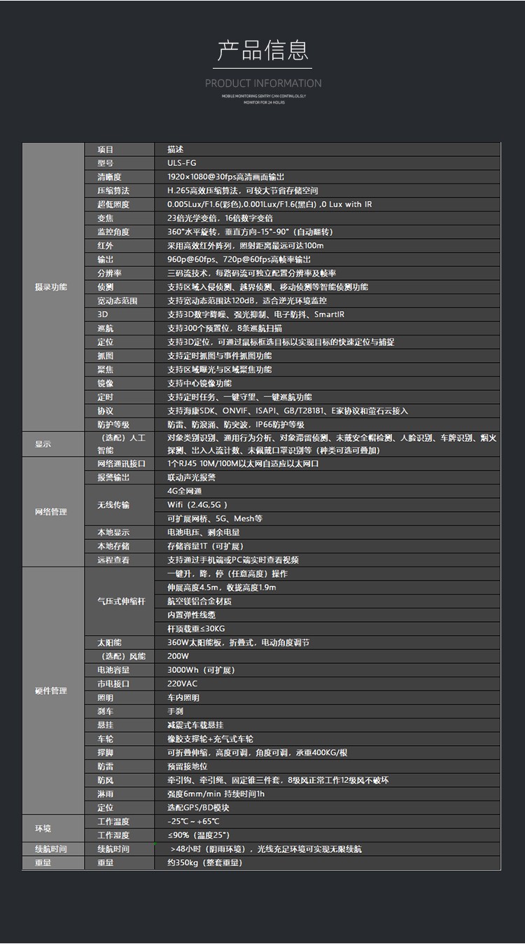 友聯(lián)哨兵雙目太陽能移動監(jiān)控 ULS-FG 友聯(lián)哨兵ULS-FG系列太陽能移動監(jiān)控系統(tǒng),采用加厚金屬機身設計,集監(jiān)控、升降、供電、控制、存儲和終端顯示于一體,通用性及耐用性更強;拖掛式運輸轉(zhuǎn)場方式,滿足快速靈活部署需求;結(jié)合風能、太陽能、蓄電池、市電等互補供電方式,無線網(wǎng)絡傳輸為主,無網(wǎng)無電的環(huán)境適用;搭載400萬360°無死角智能高清監(jiān)控攝像機,透霧性能強,拍攝不受線和天氣影響;可加選AI功能,滿足客戶智能化識別需求。